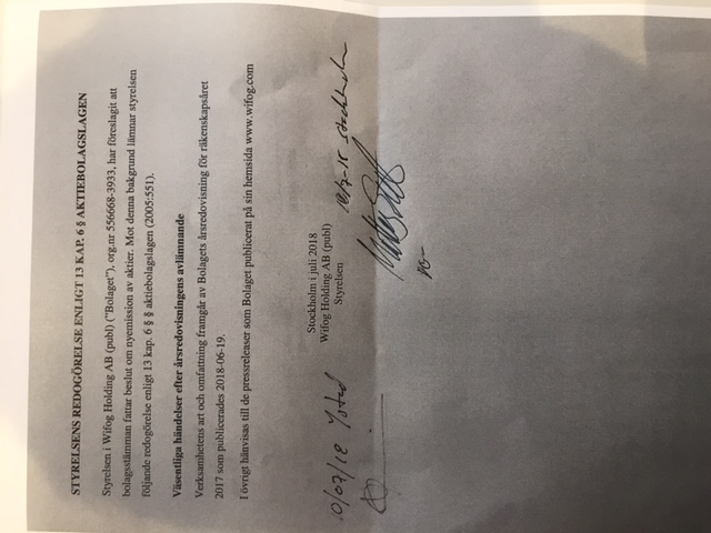 Wifog Holding AB höll extra bolagsstämma den 5 augusti 2019 kl. 12.00 på No18 på Centralplan 15 i Stockholm.